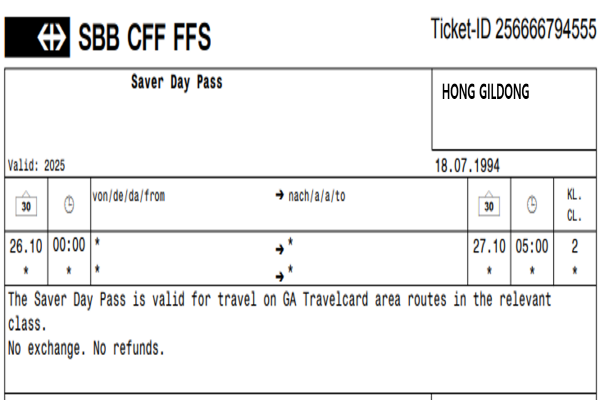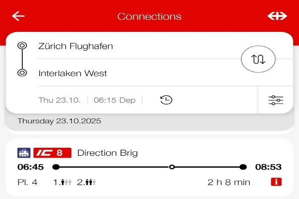 00:00 열차 취리히 공항역 출발 00:00 인터라켄 웨스트역 도착 (오픈티켓)